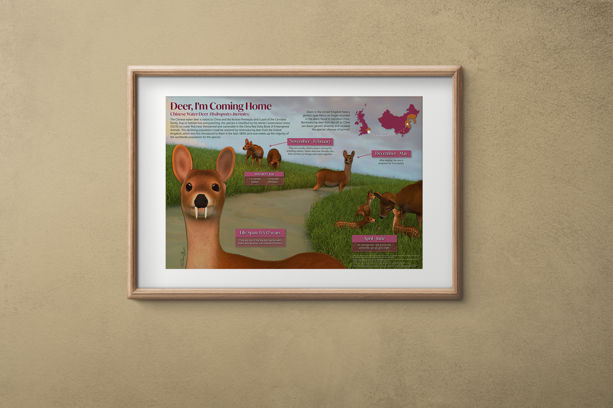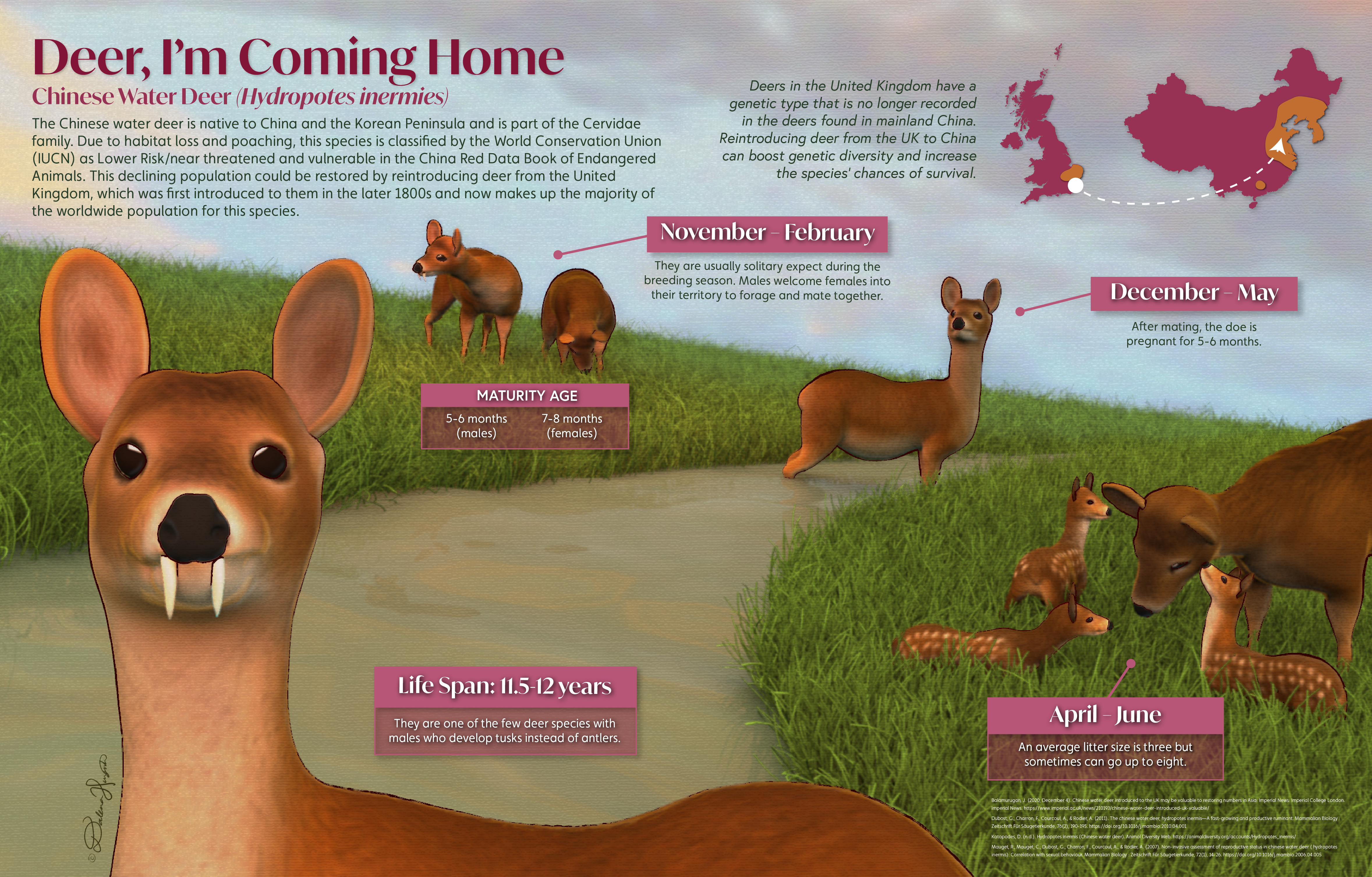 Purpose: The purpose of the educational poster was to showcase the life cycle of the Chinese water deer and briefly mention how reintroducing the Chinese water deer back to mainland China from the United Kingdom could help the deer’s genetic diversity and increase the population size. The poster uses a mix of toon shader and stylized alpha fur on the deer, a textured canvas later, and a stylized landscape to make it more visually appealing for a younger audience.