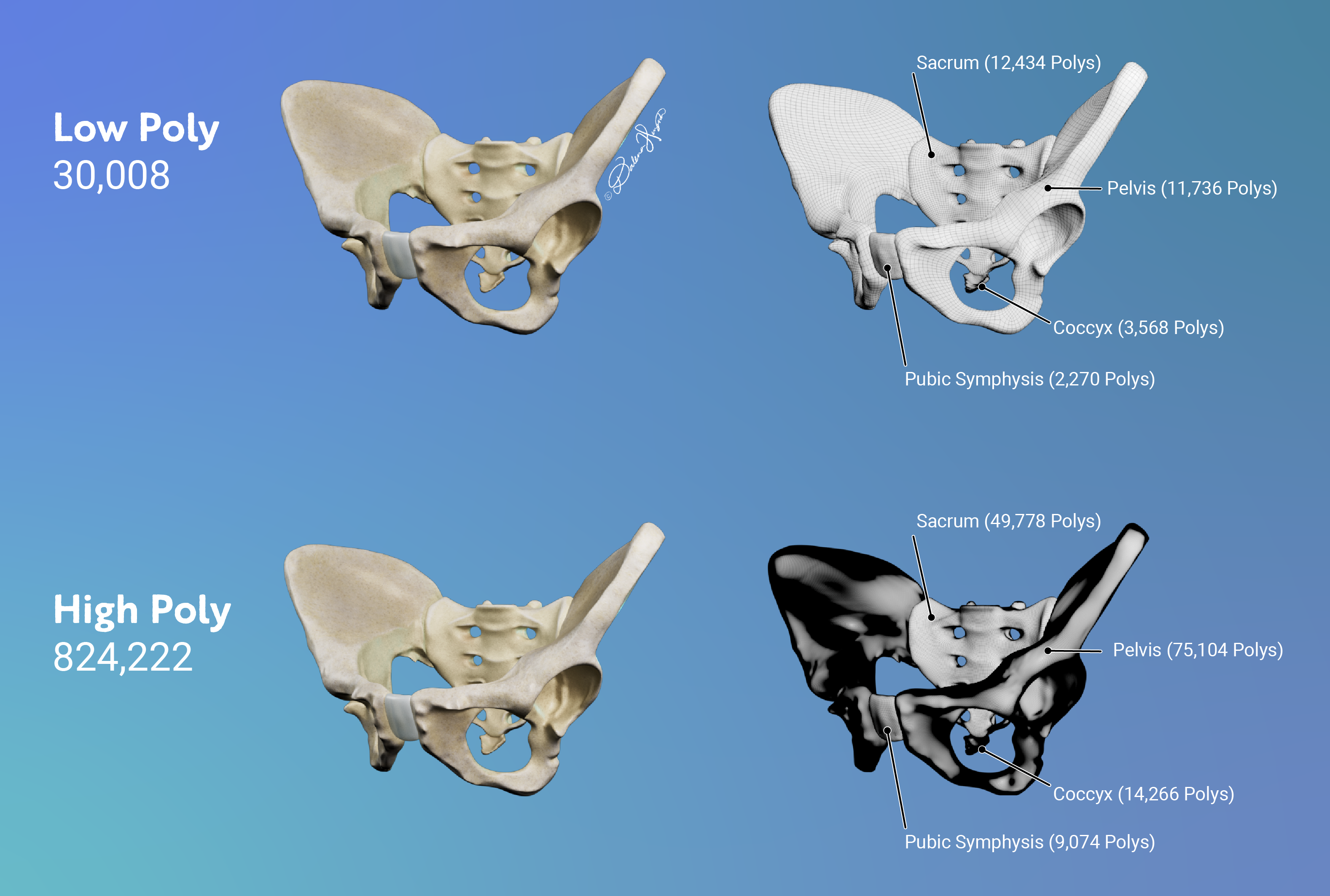Purpose: To show a side-by-side comparison of a low poly vs. high poly model of the pelvis with the same level of detail