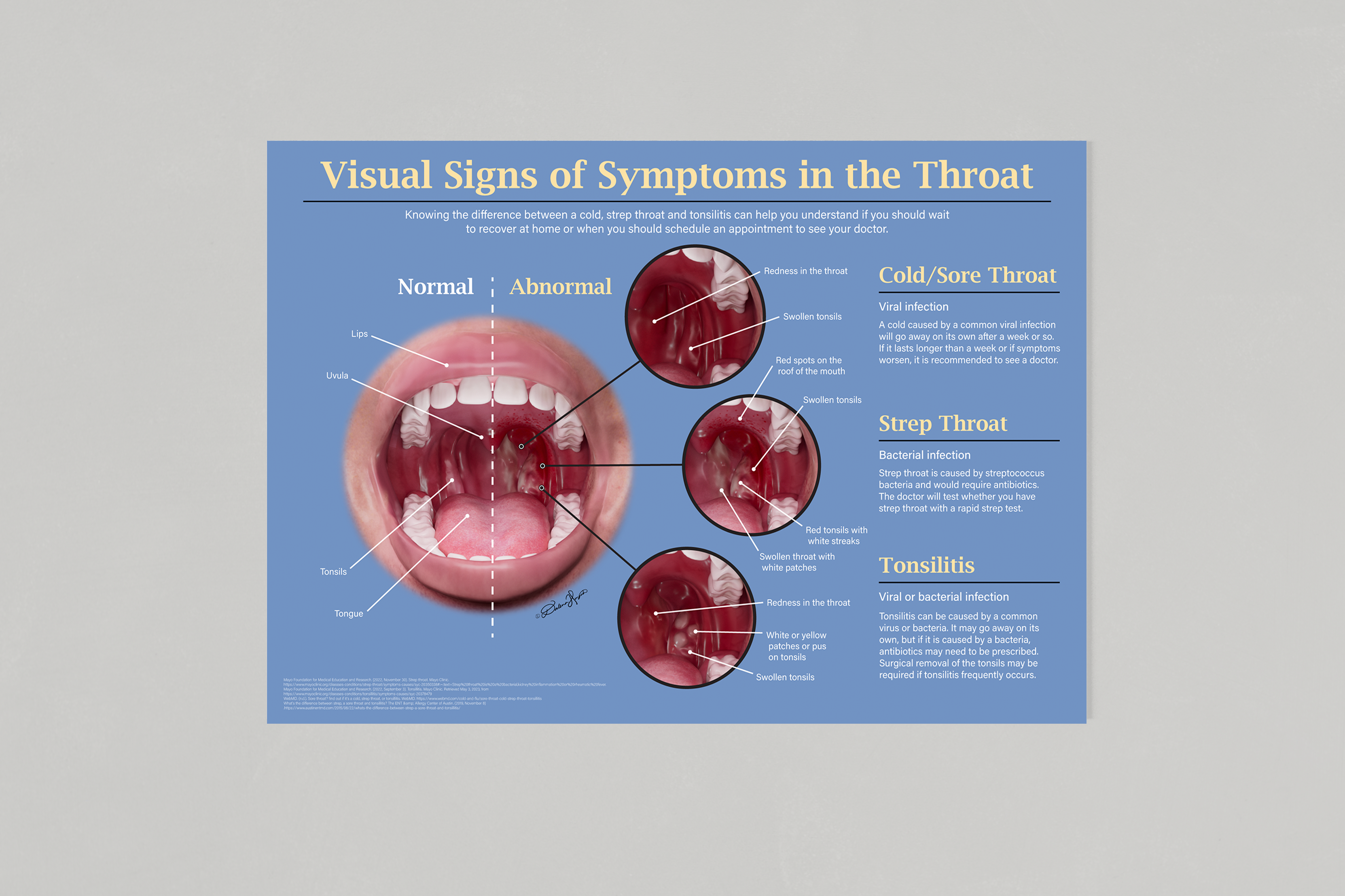 Purpose: The visual poster compares the visual signs of different symptoms related to the throat, whether it is a viral or bacterial infection, and when it’s necessary to schedule an appointment with a doctor.